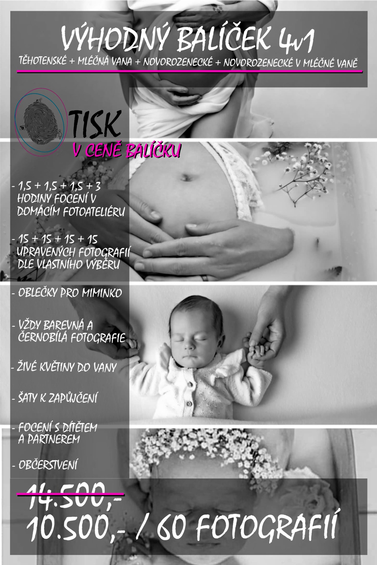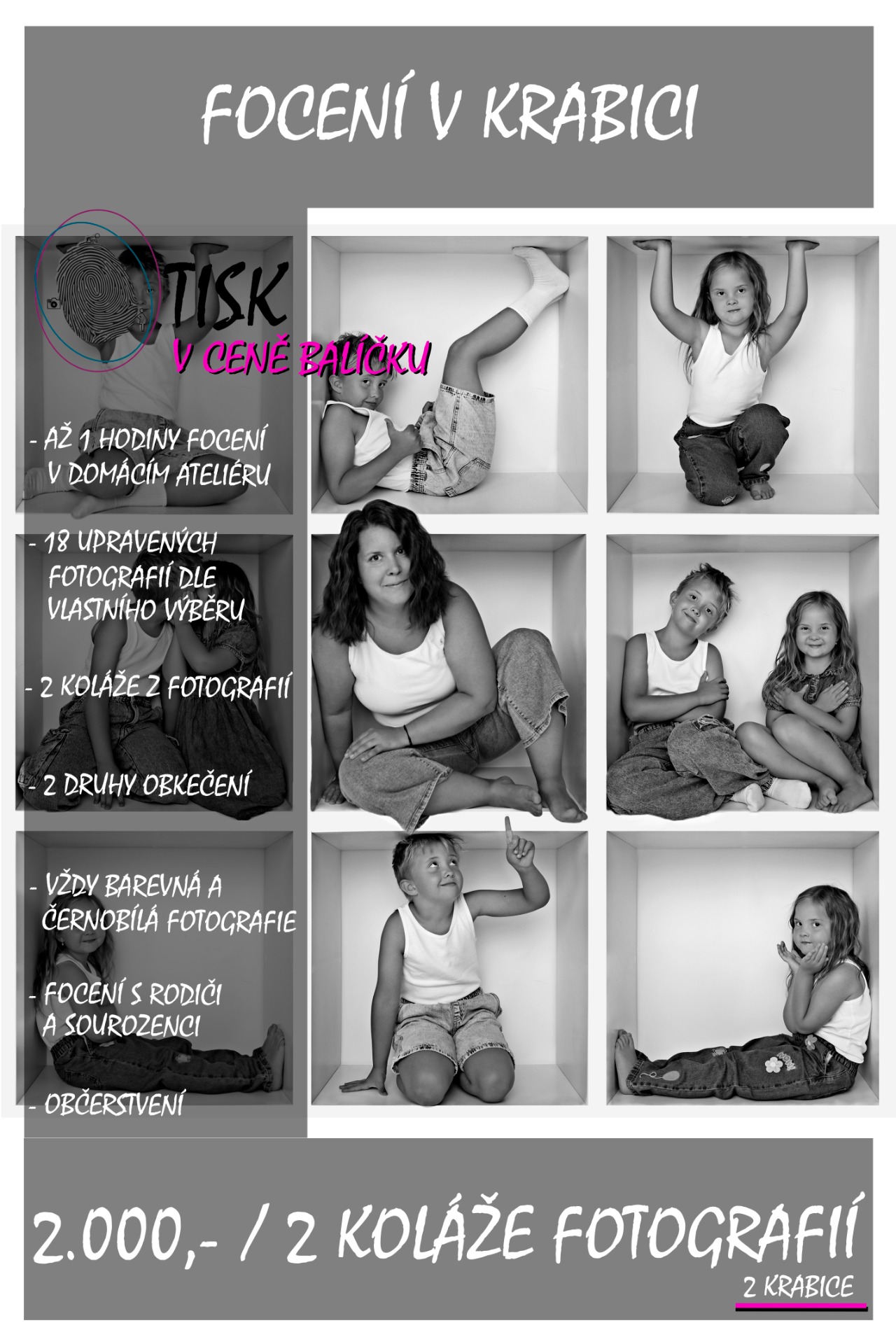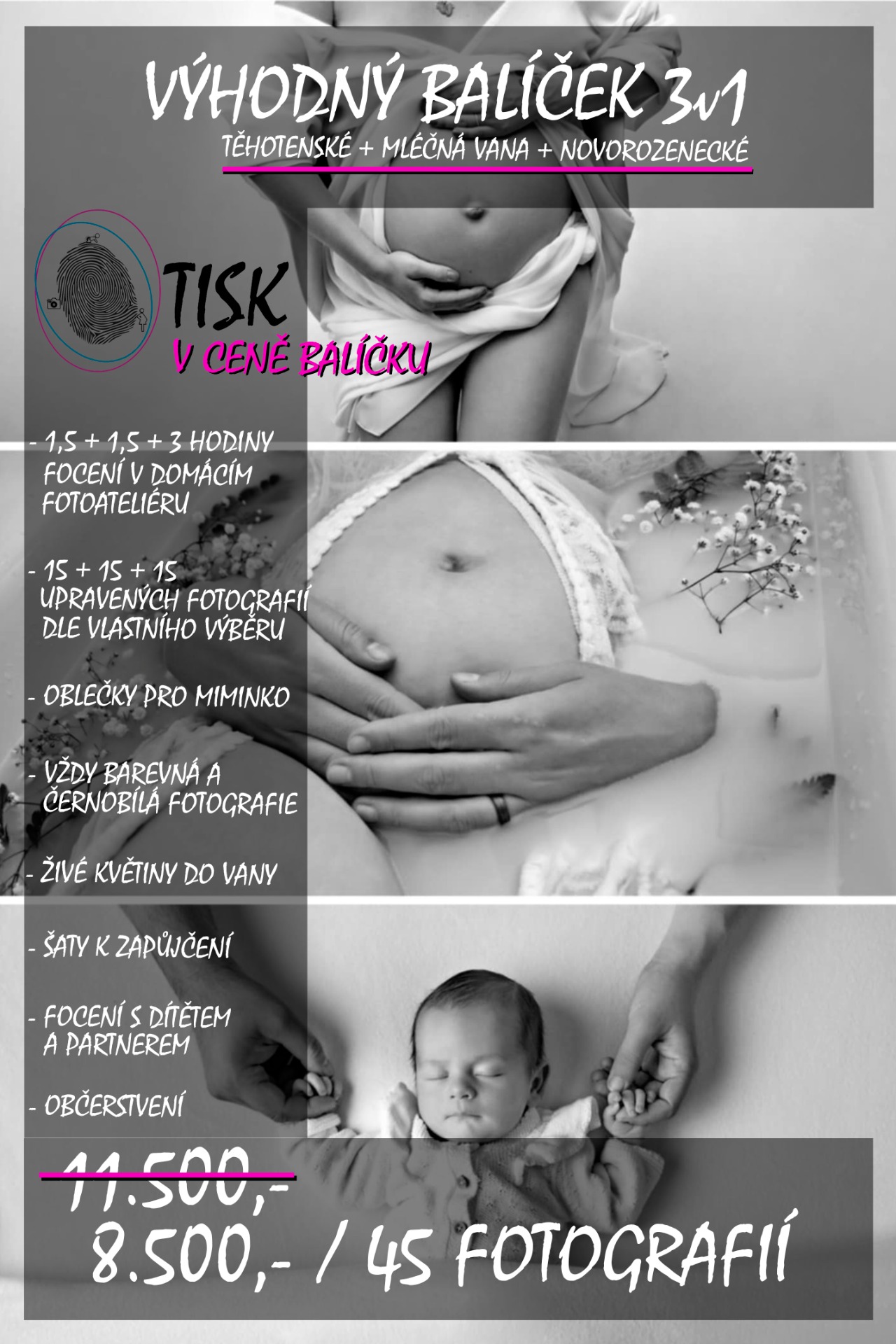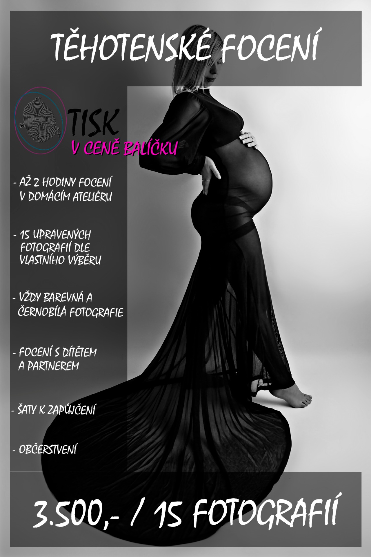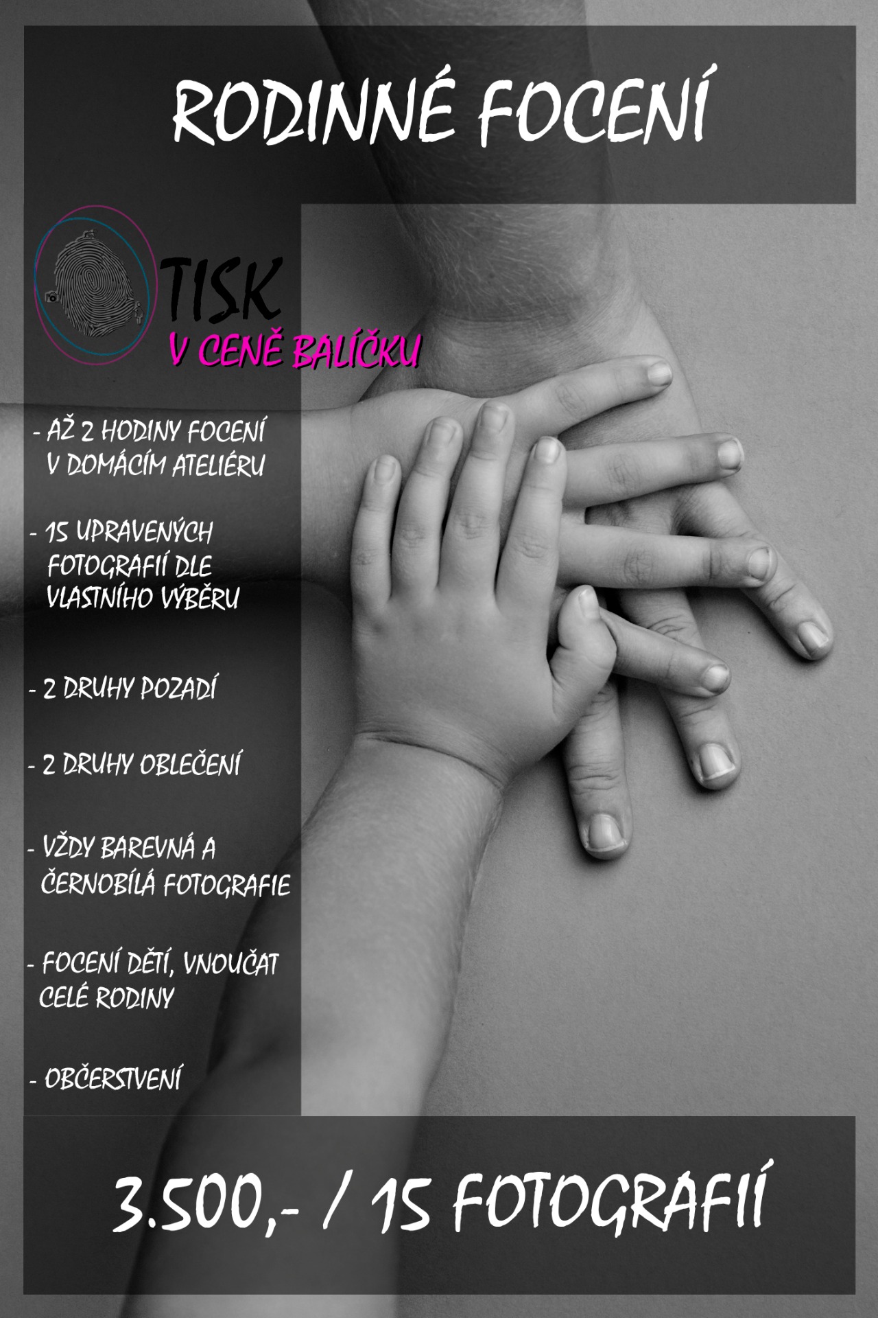CENA ZA FOCENÍ JE SLUŽBA, KTERÁ OBSAHUJE ČAS STRÁVENÝ S VÁMI, FOCENÍ, VYTVOŘENÍ NÁHLEDU FOTOGRAFIÍ PRO VÁŠ VÝBĚR, RETUŠ A KONEČNOU ÚPRAVA FOTOGRAFIÍ, ZASÍLÁNÍ BAREVNÉ A ČERNOBÍLÉ VARIANTY.